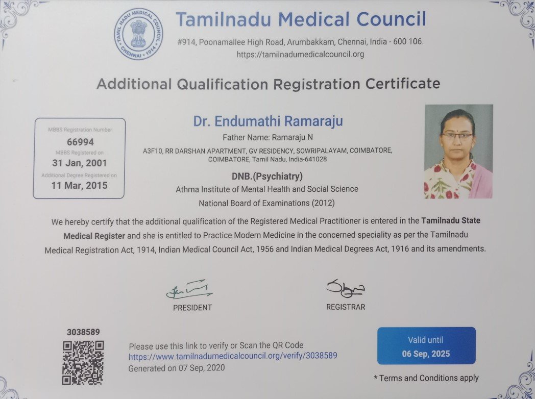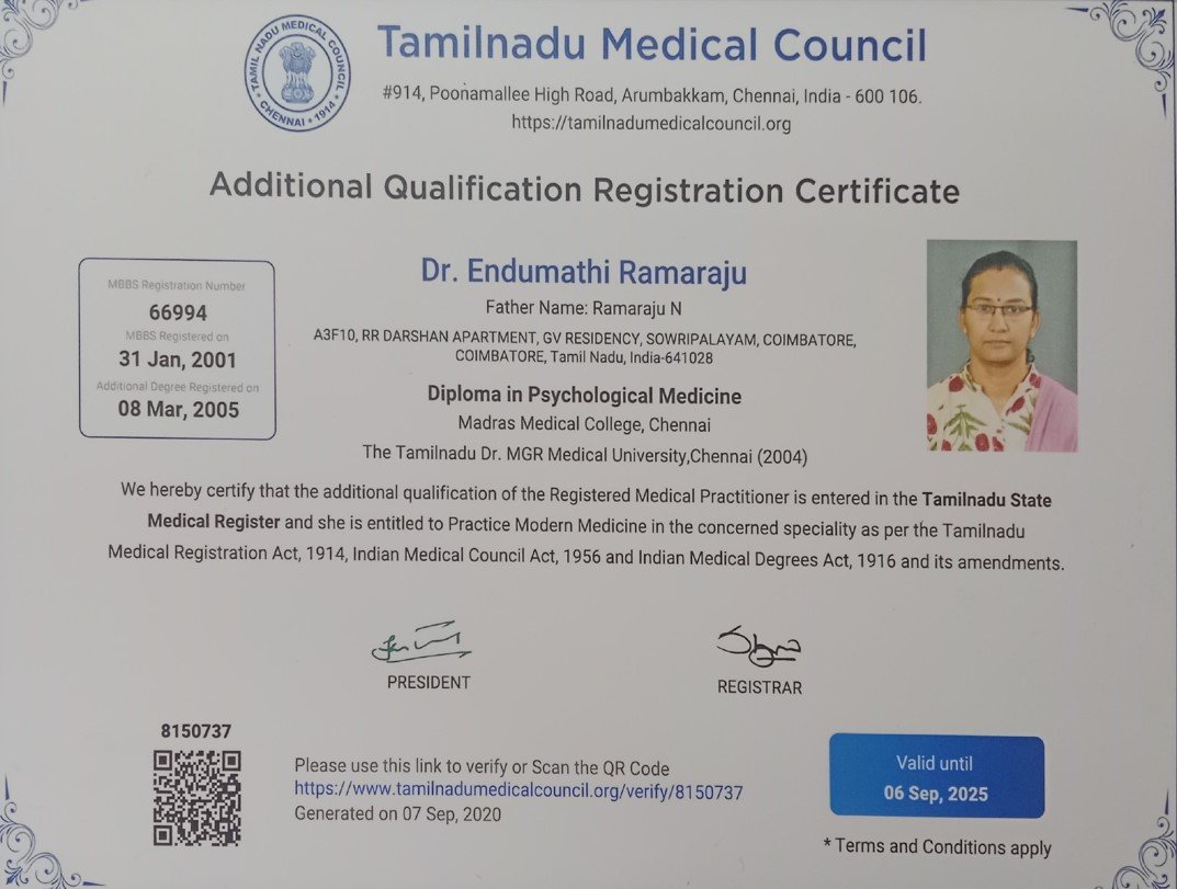 Dr. Endumathi has completed her MBBS from Coimbatore Medical College. She pursued her Diploma in Psychological Medicine from Madras Medical College. She has a rich experience of more than 20 years in Psychiatry by practicing in Premier institutions like JIPMER, Pondicherry, Mahatma Gandhi Medical College and Research Institute, Pondicherry, Vazhikatti Mental Health Centre & Research Institute, Coimbatore. Meanwhile she has completed her DNB Psychiatry, M.Sc. in Counselling and Psychotherapy.