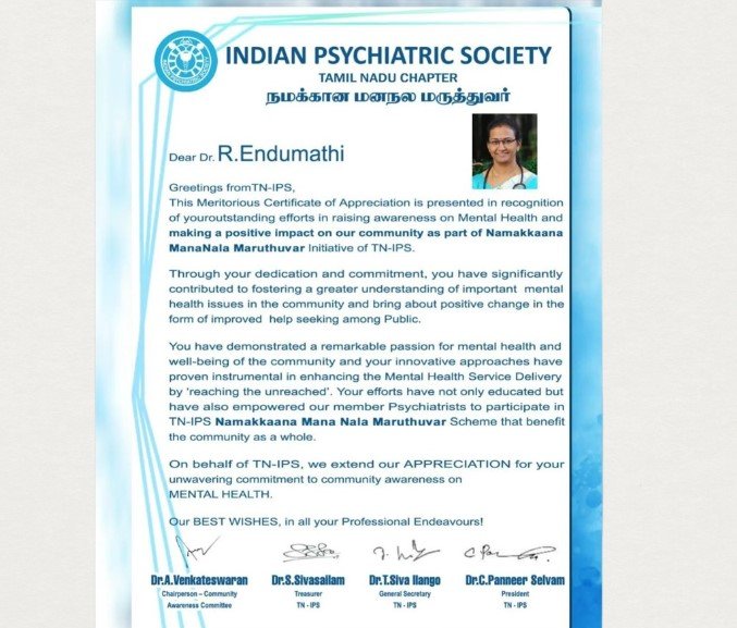 She has established her own clinic “Mathi’s Mind Care” by 2020 and serving for the Psychiatric Health care needs of the society. Her Special areas of interest are Women’s Mental Health, Perinatal Psychiatry, Management of Stress and Anxiety Disorders, De-addiction services and Promotion of Mental Health Awareness.