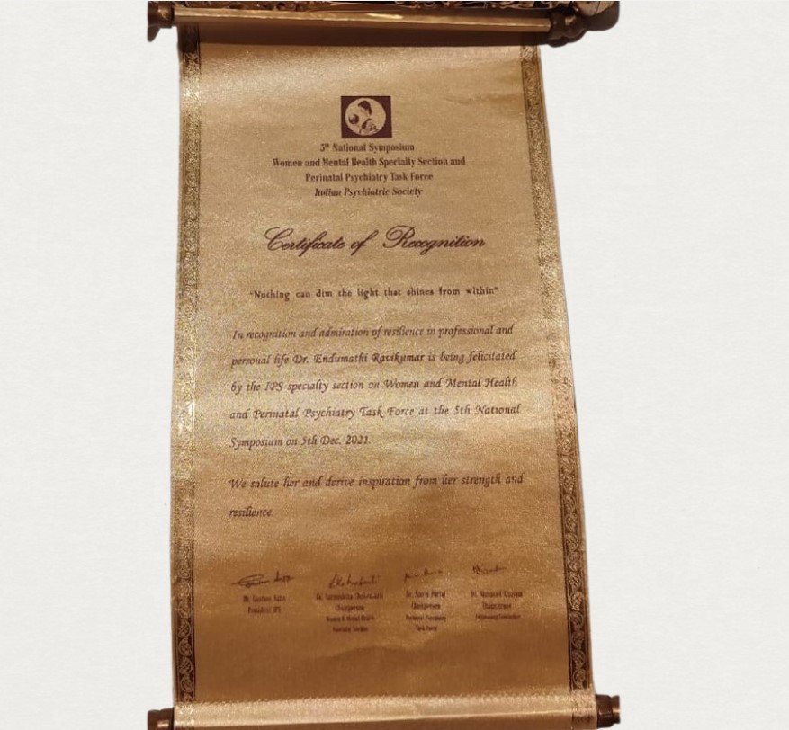 She has established her own clinic “Mathi’s Mind Care” by 2020 and serving for the Psychiatric Health care needs of the society. Her Special areas of interest are Women’s Mental Health, Perinatal Psychiatry, Management of Stress & Anxiety Disorders, De-addiction services and Promotion of Mental Health Awareness.